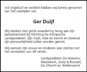 Stichting De Kempische Landgoederen heeft met ongeloof en verslagenheid kennis genomen van het overlijden van Ger Duijf.
